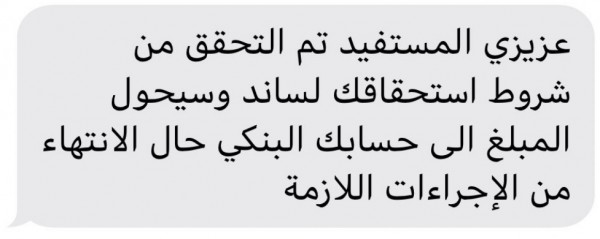 عزيزي المستفيد تم التحقق من شروط استحقاقك لساند وسيحول المبلغ الى حسابك البنكي حال الانتهاء من الإجراءات اللازمة سوبر مجيب