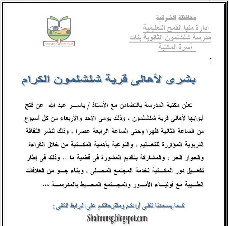 مدرسة شلشلمون الثانوية بنات تتمنى أن تكون زيارتكم لمدونتها قد أفادتكم نسألكم خالص الدعاء أهمية القراءة هنادي السعيد