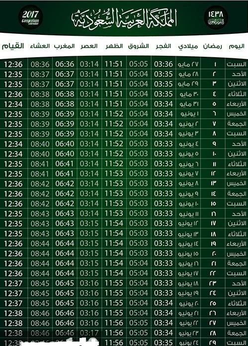 امساكية رمضان 2017 1438 ومواقيت الصلوات الخمس