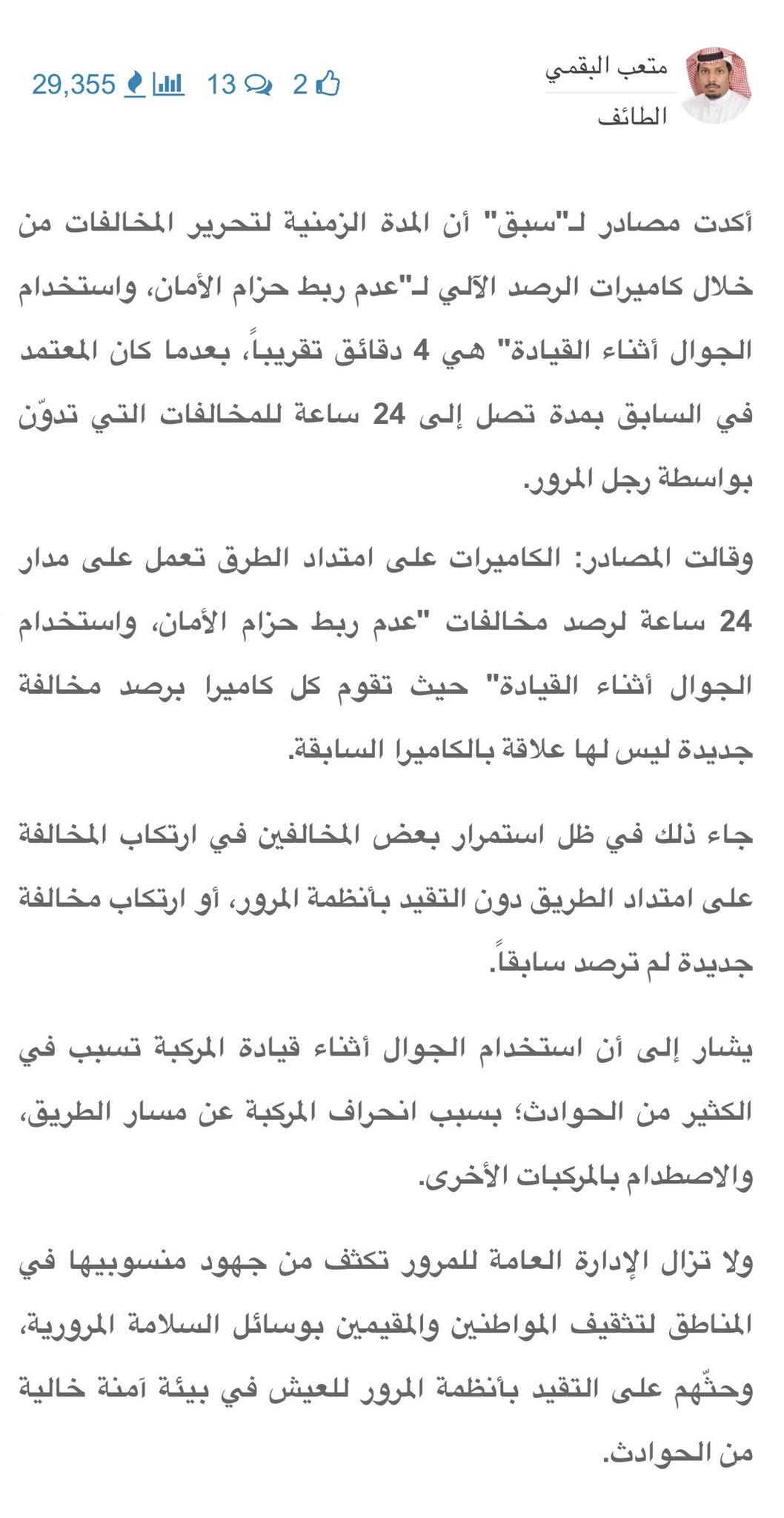 تسجيل المخالفات المرورية على استخدام الهاتف المحمول وحزام الامان صحيفة تواتر الالكترونيه