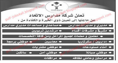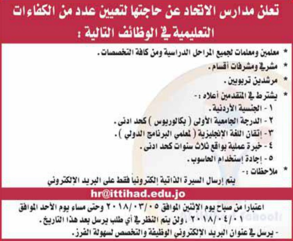 وظائف شركة مدارس الاتحاد بعم ان الاردن 2017 مطلوب معلمين ومعلمات ومديرين ومشرفين وسائقين واداريين ومحاسبين وسكرتارية