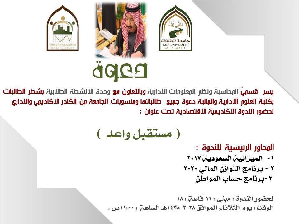 مجتمع جامعة الطائف On Twitter تقيم كلية العلوم الادارية والمالية ب شطر الطالبات الثلاثاء القادم ندوة أكاديمية اقتصادية بعنوان مستقبل واعد الموقع مبنى ١١ الوقت ١١ ص Https T Co 905xt7pek7