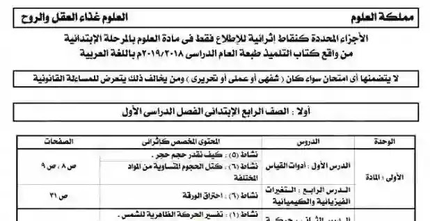 الدروس الملغية للعلوم للصف الرابع والخامس والسادس الابتدائى 2019