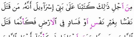 م ن أ ج ل ذ ل ك ك ت ب ن ا ع ل ى ب ن ي إ س ر ائ يل أ ن ه م ن ق ت ل ن ف س ا ب غ ي ر ن ف س أ و ف س اد ف ي ال أ ر ض ف ك أ ن م ا ق ت ل الن اس ج م يع ا و م ن أ ح ي اه ا ف ك أ ن م ا أ ح ي ا الن اس ج م يع ا و ل ق د ج اء ت ه م ر س ل ن ا
