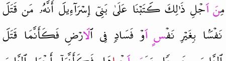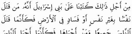 م ن ق ت ل ن ف س ا ب غ ي ر ن ف س أ و ف س اد ف ي ال أ ر ض ف ك أ ن م ا ق ت ل الن اس ج م يع ا و م ن أ ح ي اه ا ف ك أ ن م ا أ ح ي ا الن اس ج م يع ا