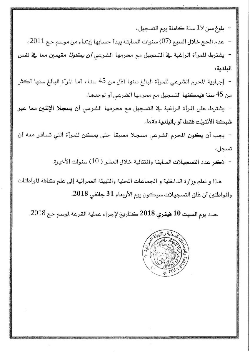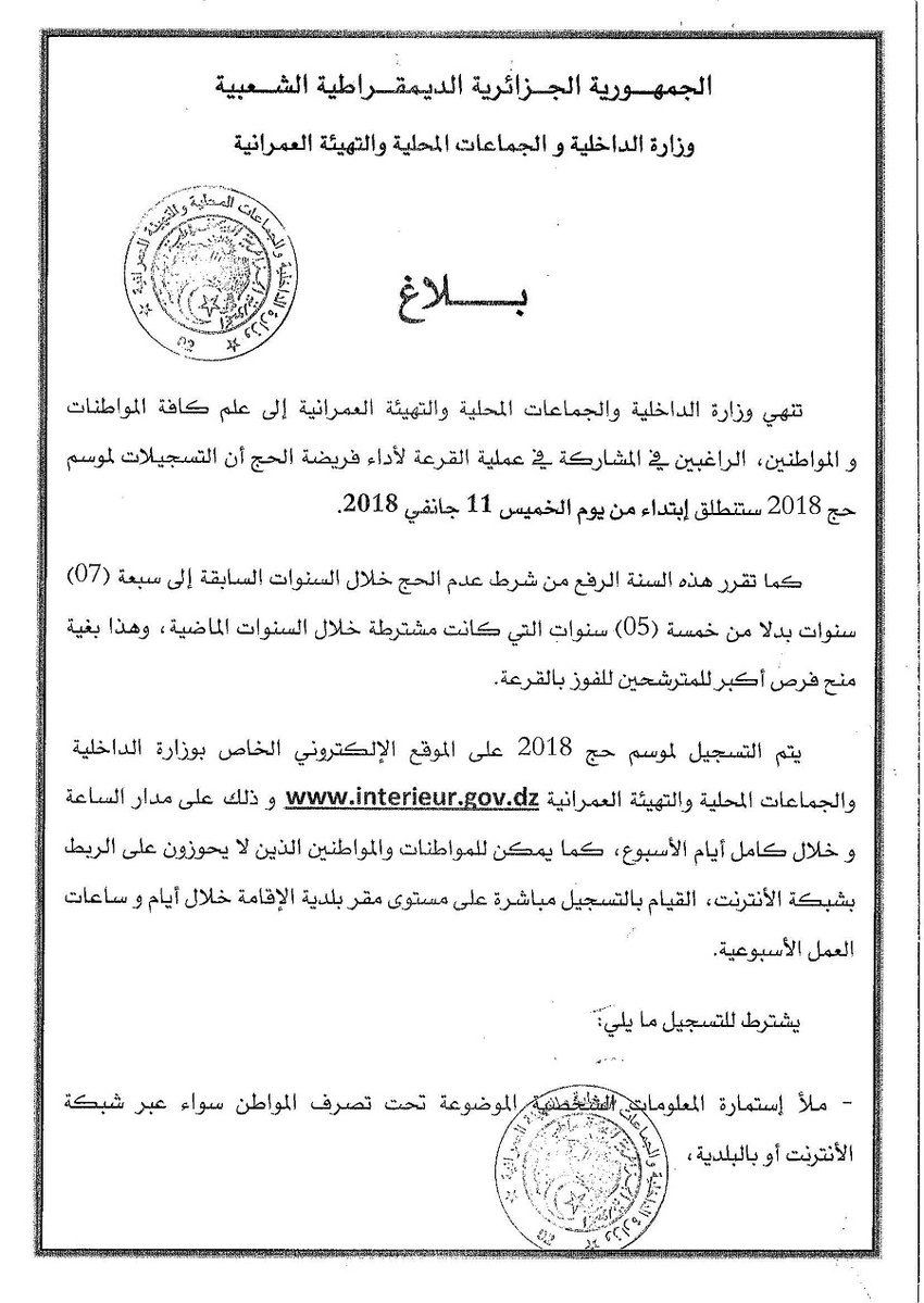 أخر ميعاد الأن رابط موقع وزارة الداخلية والجماعات المحلية تسجيلات في قرعة الحج لعام 2018 الجزائر Interieur Gov Dz