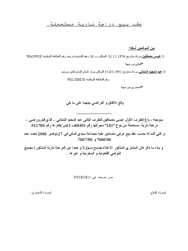عقد بيع دراجة نارية مستعملة