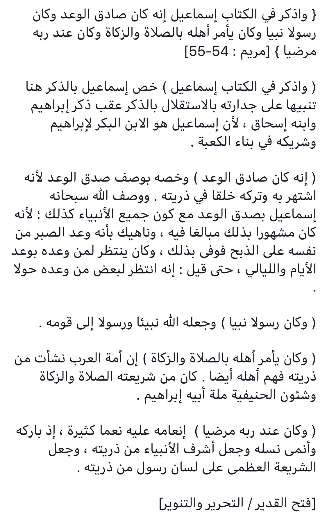 تفسير قوله تعالى واذكر في الكتاب إسماعيل إنه كان صادق الوعد وكان رسولا نبيا موسوعة المقالات الرياضية
