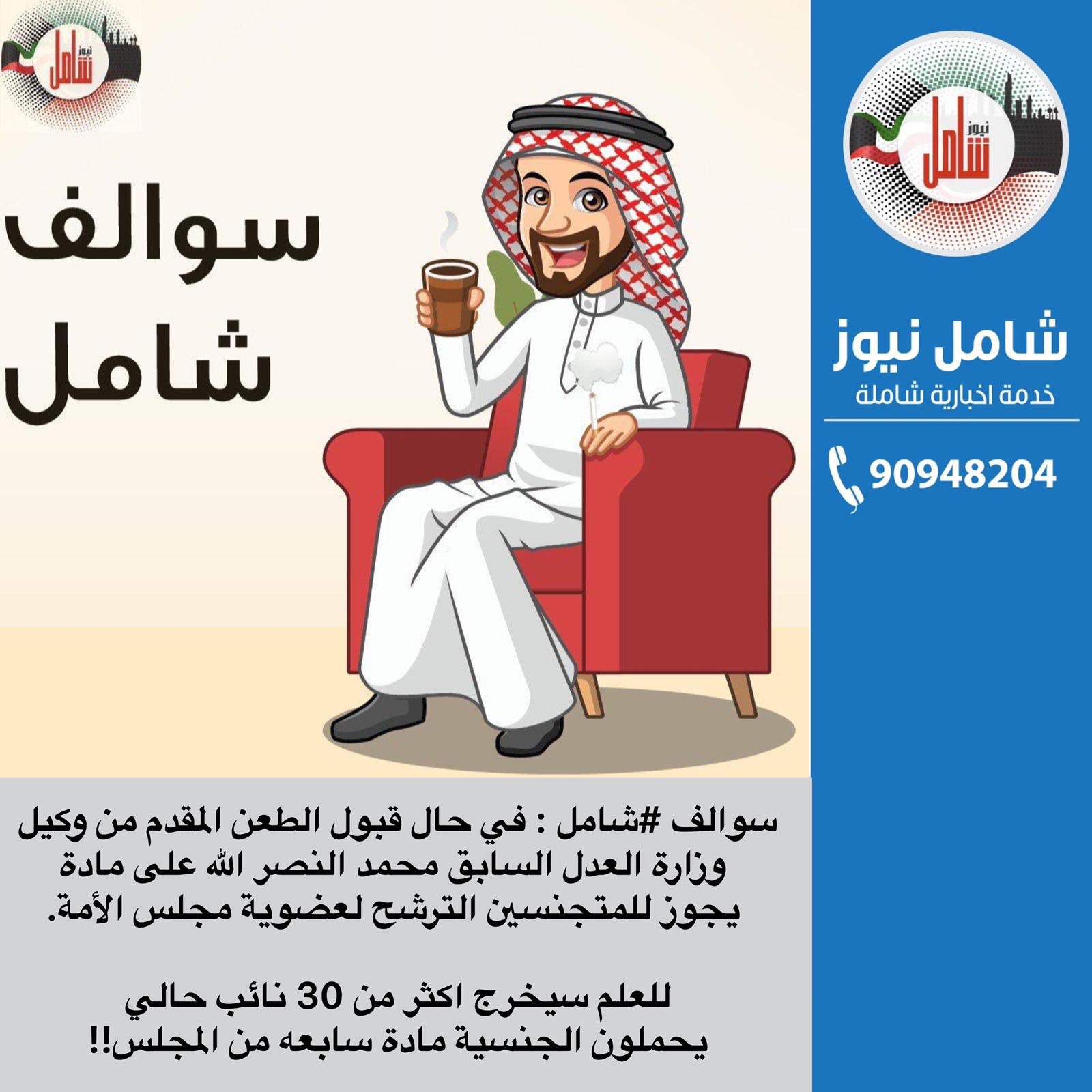 شامل نيوز Pa Twitter سوالف شامل في حال قبول الطعن المقدم من وكيل وزارة العدل السابق محمد النصر الله على مادة يجوز للمتجنسين الترشح لعضوية مجلس الأمة للعلم سيخرج اكثر